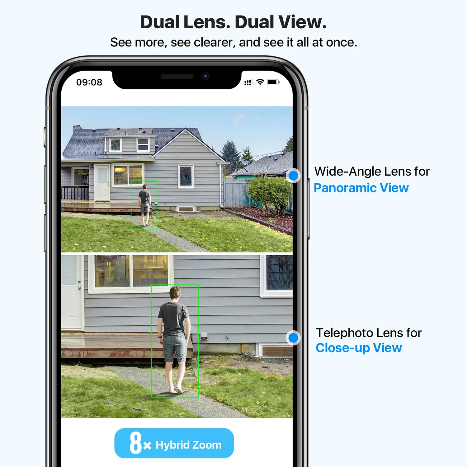 - Dual lenses deliver a wide 107° panoramic view and a close-up telephoto view in sync, so you monitor the entire scene and key details on a single screen.
